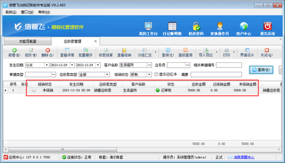 應(yīng)收、應(yīng)付賬款管理是現(xiàn)代企業(yè)資金管理的重要組成部分,其管理效果的好壞直接影響到企業(yè)經(jīng)營的成敗,出納記賬軟件中含有應(yīng)收應(yīng)付往來賬款管理功能,支持對應(yīng)收款、應(yīng)付款、預(yù)收款、預(yù)付款、退貨款等進行管理。如果應(yīng)收款已結(jié)銷后發(fā)現(xiàn)收款結(jié)銷錯誤,需要刪除結(jié)銷記錄,如何刪除?本文演示一下詳細操作步驟。 如下圖所示,客戶“生活超市”應(yīng)收款5000元已結(jié)銷完畢,結(jié)銷后發(fā)現(xiàn)結(jié)銷錯誤,需要刪除,將應(yīng)收款結(jié)銷狀態(tài)恢復(fù)到“未結(jié)銷”狀態(tài)。 在應(yīng)收款管理界面,選擇已結(jié)銷的應(yīng)收款記錄,然后點擊工具欄“查看結(jié)銷”按鈕,可以