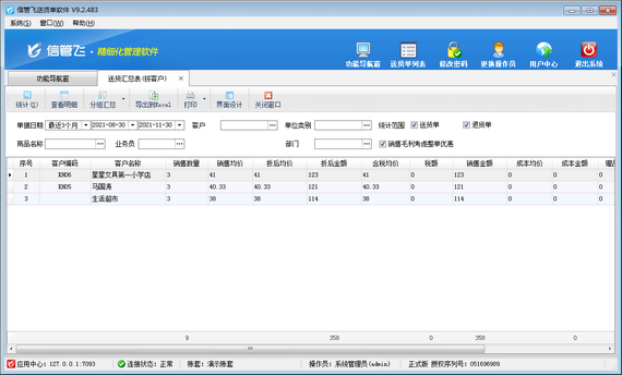 信管飛送貨單軟件為集訂單管理、送貨管理、收款結(jié)算等功能并支持送貨明細對賬及業(yè)務(wù)綜合對賬的送貨單打印軟件。軟件根據(jù)錄入的每張訂單及送貨單等數(shù)據(jù),可以自動生成統(tǒng)計報表,完成企業(yè)銷售統(tǒng)計查詢和與客戶送貨明細對賬的目的,如下圖所示。 其中,送貨匯總表(按客戶)可根據(jù)單據(jù)日期、客戶名稱、商品名稱等查詢條件,統(tǒng)計銷售給每個客戶的商品匯總數(shù)量、銷售均價、銷售金額、成本金額、稅額以及優(yōu)惠情況。 在功能導(dǎo)航窗點“業(yè)務(wù)處理”,軟件最右側(cè)相關(guān)查詢統(tǒng)計中點擊“送貨匯總表(按客戶)”,即可進入“送貨匯總表(按客
