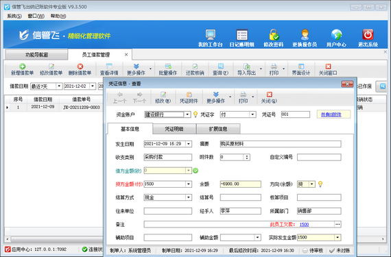信管飛出納記賬軟件專業(yè)版的員工借款管理及還款管理可以對企業(yè)員工借款、還款進行流程化登記管理,提高了企業(yè)管理效率。員工借款后,借款單支持轉(zhuǎn)記憑證,本篇文章介紹一下如何查看員工借款相關(guān)日記賬憑證? 在功能導(dǎo)航窗點擊“綜合管理”—》“員工借款管理”即可進入“員工借款管理”界面,如下圖所示: 在員工借款管理界面可以查看、新增、修改、刪除借款單,借款單如轉(zhuǎn)記憑證,在工具欄點擊“更多操作”—》“查看日記賬憑證”即可查看此借款單相關(guān)日記賬憑證,如下圖所示。 相關(guān)文