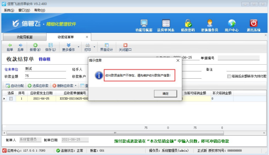 信管飛軟件包括信管飛RMS軟件、信管飛出納記賬軟件、信管飛送貨單軟件(送貨單軟件只有應收款),支持對應收應付款進行收付款結算操作,方便用戶查看收付款情況。對于客戶在結算時保存不了結算單,本篇文章以收款結算單進行示范下如何解決。 一、保存時提示“收款金額+優惠金額大于本次結銷金額合計”,無法保存。如下圖所示: 解決辦法:存在以下兩種情況: 1.收款金額=本次結銷金額 &