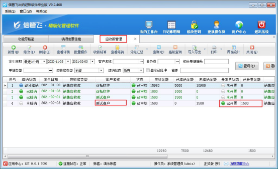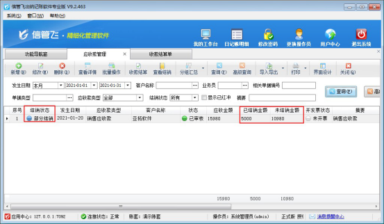 信管飛出納記賬軟件支持登記應(yīng)收應(yīng)付款,應(yīng)收應(yīng)付款存在分批次結(jié)銷情況,本文以“出納記賬軟件應(yīng)收款”為例,示范下如何部分結(jié)銷? 在功能導(dǎo)航窗點(diǎn)擊“往來管理”—》“應(yīng)收款管理”進(jìn)入應(yīng)收款管理界面,在應(yīng)收款管理界面選擇未結(jié)銷的應(yīng)收款,點(diǎn)擊工具欄的“收款結(jié)算”進(jìn)行收款操作,如下圖所示: 選擇示例客戶“亞拓軟件”,應(yīng)收款為15980元,本次收款5000元,選擇應(yīng)收款單據(jù)點(diǎn)擊“收款結(jié)算”,彈出的收款結(jié)算單界面,收款金額輸入5000,點(diǎn)擊“自動分配”分配到本次結(jié)銷金