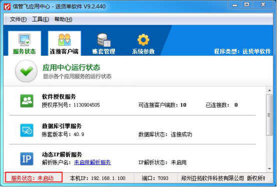 信管飛系列軟件,采用先進的多層技術體系架構,程序運行安全、穩定、高效?蛻舳顺绦蚺c服務器端程序(即“信管飛軟件應用中心”程序)進行通訊,需要設置通訊端口,有用戶打開應用中心程序的時候提示服務狀態未啟動(如下圖),軟件無法登錄,這種是端口被占用導致,解決方法如下 打開應用中心程序,點擊“系統參數”,在基本參數中修改下端口號,比如送貨單默認端口號是7093,如果占用沖突,可修改為7094、7095...,修改后點擊保存,然后退出重啟應用中心程序,如下圖所示: