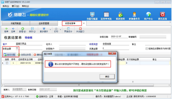 信管飛送貨單軟件是一款集開單送貨和應收款管理的軟件,軟件開單后可對開單生成對應的應收款進行收款結算,有客戶開收款結算單時候,輸入收款金額點擊保存會提示“默認收付款資金賬戶不存在,請先設定默認收付款資金賬戶!”,無法保存單據,如下圖所示: 這種情況是因為在系統內沒有設置默認資金賬戶導致的,請在功能導航窗點擊“基礎資料”—》“資金賬戶”打開資金賬戶管理界面修改資金賬戶設置為默認資金賬戶即可,如下圖所示: 默認資金賬戶設置好后,重新