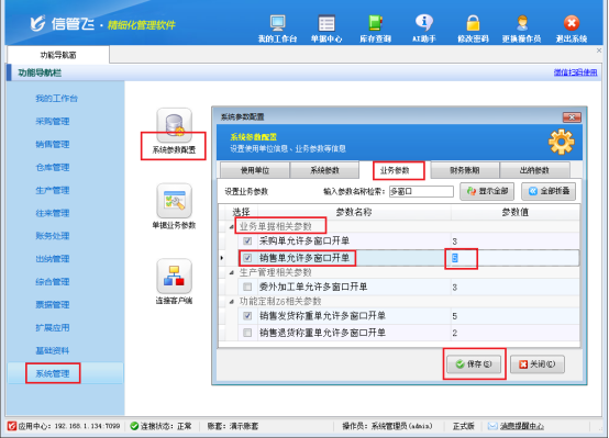 信管飛進銷存軟件中可以設置同一商品不同的客戶型號,方便用戶管理同一個商品多型號的情況,本篇文章以信管飛RMS軟件來詳細介紹一下如何啟用同一商品不同的客戶型號功能? 觀看演示視頻,快速設置同一商品不同客戶型號的設置方法。鏈接已備,點擊即學。 在功能導航窗點擊“系統管理”——》“系統參數設置”——》“業務參數”可以進入到“業務參數”配置界面,在用戶定制功能參數內打勾啟用“啟用商品的客戶型號管理”參數,并設置商品信息中不同客戶的客戶型號,如下圖所