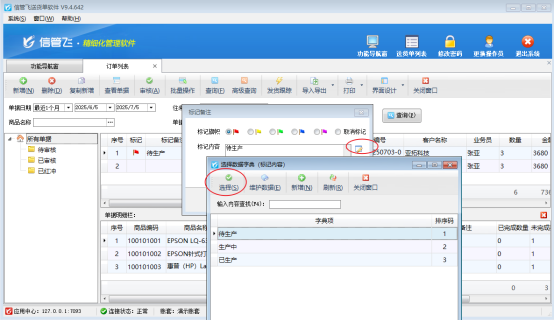 信管飛軟件支持對訂單列表、送貨單列表以及退貨單列表使用不同顏色旗幟標記備注,把標記常用內容可提前維護到數據字典中,方便標記時候直接選擇錄入,例如訂單列表,可以先把生產狀態維護在數據字典中,標記直接使用。本文示范下如何操作? 訂單列表界面,雙擊標記備注項,點擊維護標記備注內容,進入選擇數據字典(標記內容)界面,點擊維護數據可進入標記內容維護。 在標記內容維護界面點擊新增,可以增加固定選項的標記內容名稱。 &