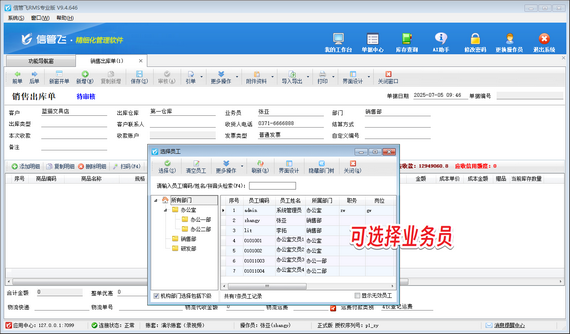 有用戶操作員賬號登錄軟件在新增單據時,無法選擇業務員,如下圖所示,選擇業務員窗口看不到員工信息。 演示視頻觀看鏈接:選擇業務員窗口看不到員工信息,如何解決演示視頻 出現以上問題的原因是:當前登錄的操作員賬號沒有查看部門員工的權限。 解決方法如下:使用系統管理員賬號登錄軟件,在功能導航窗點擊“系統管理”—》“操作員及授權”打開操作員管理及授權界面,選擇操作員賬號,在“數據權限”界面將部門員工“查看所有數據”的權限勾選上,然后保存權限設置,如下圖所示。&