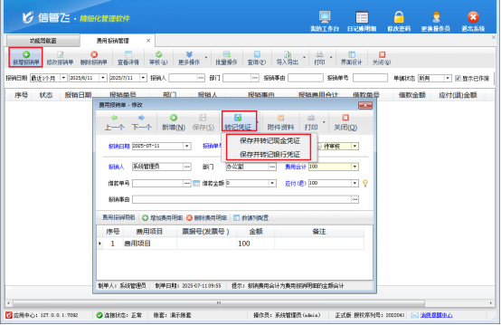 在企業財務流程里,員工先行墊付費用、事后報銷是常見操作。而出納將費用報銷單準確轉記到流水賬、生成出納憑證,傳統方式既繁瑣又易出錯。信管飛出納記賬軟件憑借便捷操作,讓這一過程輕松又高效。 操作便捷,流程清晰 快速錄入報銷單:在軟件功能導航窗點擊“綜合管理”—》“費用報銷管理”,進入報銷管理界面。新增錄入報銷單,信息填寫直觀簡單,完成后點擊保存,輕松完成報銷單創建。 靈活轉記憑證:在新增報銷單界面,點擊“轉記憑證”,報銷單可靈活選