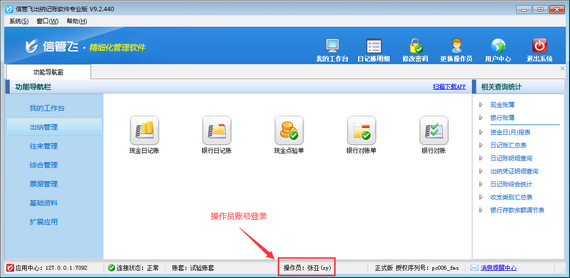 信管飛出納記賬軟件包括期末結賬的功能,當本期(即本月)的業務已審核處理完畢,就可以進行期末結賬處理。結賬后自動進入下一個賬期(月份),12月份結賬后將進入下一個年度。結賬后如果發現單據錯誤或賬簿數據有誤,可以進行反結賬處理。 另外,軟件支持操作員賬號及權限管理功能,支持設置多個操作員賬號可登錄軟件,本篇文章介紹一下如何設置操作員不可操作出納期末結賬功能? 用系統管理員賬號登錄軟件,在功能導航窗點擊“系統管理”—》“操作員及授權”,進入“操作員管理及授權”界面,選擇操作員“張亞”,在其右