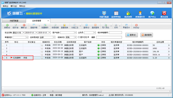 信管飛送貨單軟件支持管理客戶的應收款信息,可對應收款信息標記備注內容,本文演示一下具體操作步驟。 軟件登錄后,點擊“業務處理”—》“應收款管理”可以打開應收款管理界面,如下圖所示,應收款管理界面可以查看客戶的應收款信息及詳細結銷情況,應收款記錄一般由送貨單自動生成,其類型為“銷售應收款”,或者由退貨單自動生成,其類型為“銷售退貨應退款”。 在應收款管理界面,選中一條應收款記錄后,雙擊“標記”列,系統彈出“標記備注”窗口,在“標記備注”窗口選擇標記旗幟,錄入標記內容,然后點擊“標記”按鈕