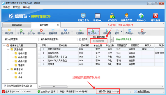 信管飛送貨單軟件、信管飛RMS(進銷存管理軟件)、信管飛倉庫管理軟件等都支持管理基礎資料信息和允許設置多個操作員進行登錄軟件。軟件支持將基礎資料信息以EXCEL的形式導出放到自定義的文件夾內以便備份或保存,如果需要設置操作員不允許導出客戶信息,如何設置?本文以進銷存管理軟件為例,示范下如何設置操作員不可導出客戶信息。 在功能導航窗點擊“系統管理”—》“操作員及授權”打開操作員管理及授權界面,選擇操作員“張亞”,在功能模塊權限界面,選擇“基礎資料”—》“客戶信息”,在導出權限下,把客戶信息“導出”權限勾選取消后保存權限設置