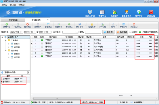 信管飛RMS標準版和專業版都包括出納管理模塊,都支持設置操作員不可查看出納日記賬資金賬戶余額權限,本篇文章以信管飛RMS專業版為例詳細介紹一下如何設置操作員不可查看出納日記賬資金賬戶余額。 在功能導航窗點“系統管理”—》“操作員及授權”即可進入“操作員管理及授權”界面,選中操作員賬號,在“其他操作權限”界面將“不可查看出納日記賬資金賬戶余額”權限勾選上,如下圖1所示,設置操作員賬號“張亞”不可查看出納日記賬資金賬戶余額。圖1 設置操作員權限 設置完成之后,我們使用操作員“張亞”登錄軟件