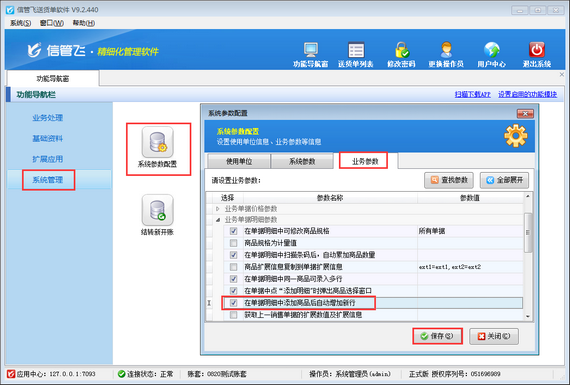 部分用戶在剛開始試用軟件時,開單添加一個商品后,不清楚如何在單據明細內繼續增加新的商品信息,如下圖所示,此問題在鍵盤上面按方向下鍵即可在單據明細中增加一行新行,另外軟件也支持設置在單據明細中添加商品后自動增加新行,本文以送貨單軟件為例演示一下具體設置方法。 在功能導航窗點擊“系統管理”—》“系統參數設置”—》“業務參數”,然后在業務單據明細參數中啟用“在單據明細中添加商品后自動增加新行”參數,如下圖所示。 “在單據明細中添加商品后自動增加新行”參數啟用后,新開送貨單添加商品