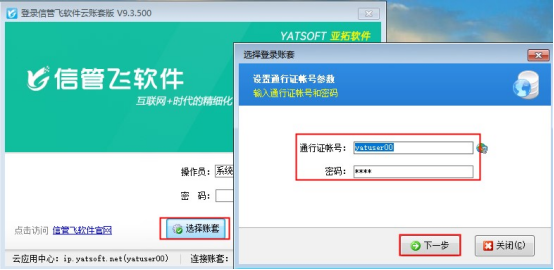 信管飛所有軟件都支持云賬套服務模式,數據存在云服務上,本地只要有網絡就可以登錄使用。可支持電腦端和手機端連接云端數據。云賬套購買后會分配通行證賬號和密碼。本文示范下云賬套模式如何登錄使用?一、電腦端使用 電腦只需要安裝云賬套版本程序(藍色圖標),登錄軟件點擊“選擇賬套”按鈕,彈出輸入界面,輸入通行證賬號和密碼,如下圖所示: 輸入通行證賬號和密碼后,點擊下一步會進入選擇登錄賬套界面,新賬號登錄需要新增賬套,在“管理賬套”中點擊新建賬套,輸入賬套名稱新