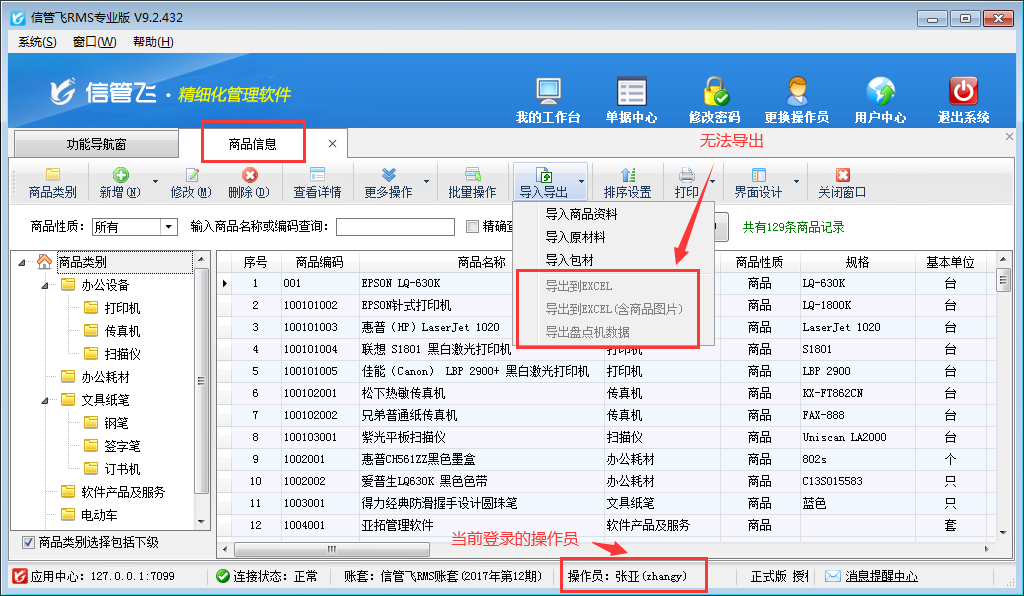 信管飛送貨單軟件、信管飛RMS、信管飛倉庫管理軟件等都支持管理基礎資料信息和允許設置多個操作員進行登錄軟件。軟件支持將基礎資料信息以EXCEL的形式導出放到自定義的文件夾內以便用戶備份或保存數據,如果需要設置操作員不允許導出商品信息,如何設置?本文以信管飛RMS專業版為例,示范下如何設置操作員不可導出商品信息。 在功能導航窗點擊“系統管理”—》“操作員及授權”打開操作員管理及授權界面,選擇操作員“張亞”,在功能模塊權限界面,選擇“基礎資料”—》“商品信息”,在導出權限下,把商品信息“導出”權限勾選取消后保存權限,如下圖所