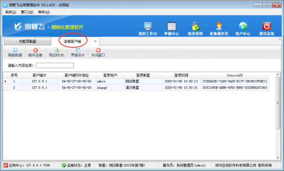 亞拓軟件自主研發(fā)的信管飛RMS(進(jìn)銷(xiāo)存軟件)、信管飛倉(cāng)庫(kù)管理軟件、信管飛送貨單軟件、信管飛出納記賬軟件等軟件都支持多用戶(hù)同時(shí)登錄使用軟件,數(shù)據(jù)同步共享。 本文以信管飛倉(cāng)庫(kù)管理軟件為例,介紹一下如何查看已登錄軟件的連接客戶(hù)端。 第一種方法:在信管飛倉(cāng)庫(kù)管理軟件應(yīng)用中心程序中查看已登錄軟件的連接客戶(hù)端。 應(yīng)用中心程序運(yùn)行后,在桌面右下角顯示應(yīng)用中心(紅色)圖標(biāo),雙擊即可打開(kāi)應(yīng)用中心主界面,如下圖所示,點(diǎn)擊“連接客戶(hù)端”,可以管理已連接到主機(jī)的客戶(hù)端電腦信