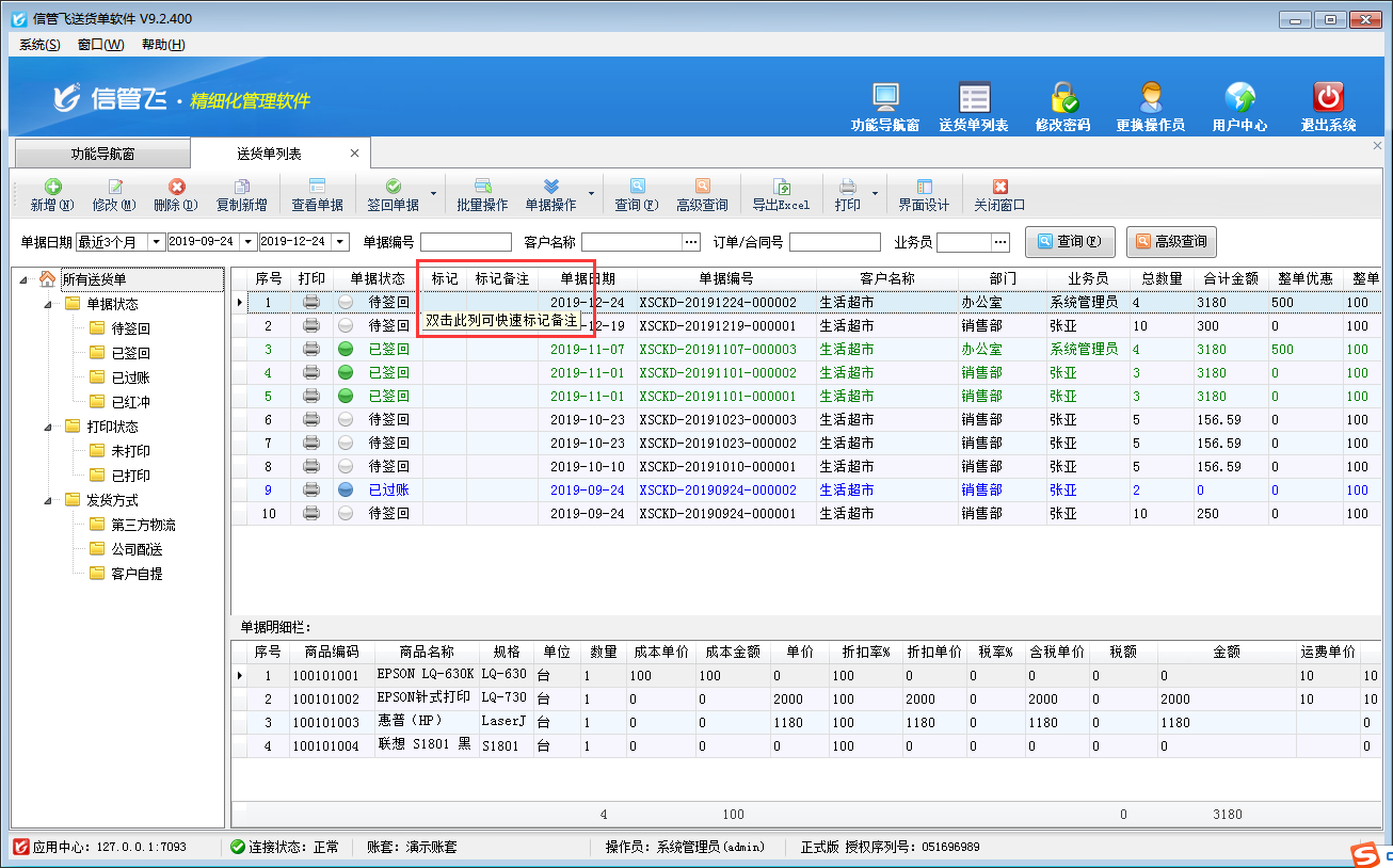 信管飛送貨單軟件支持對(duì)訂單列表、送貨單列表以及退貨單列表標(biāo)記備注。本文介紹一下送貨單軟件中對(duì)送貨單列表標(biāo)記備注的具體操作步驟。 在功能導(dǎo)航窗點(diǎn)“業(yè)務(wù)處理”—》“送貨單列表”即可進(jìn)入“送貨單列表”界面,然后在送貨單列表界面,選中一條單據(jù)記錄后,點(diǎn)擊“單據(jù)操作”—》“標(biāo)記備注”,系統(tǒng)彈出“標(biāo)記備注”窗口,如下圖所示。 在“標(biāo)記備注”窗口選擇標(biāo)記旗幟,錄入標(biāo)記內(nèi)容,然后點(diǎn)擊“標(biāo)記”按鈕即可標(biāo)記單據(jù)備注。 標(biāo)記備注后,送貨單列表界面會(huì)顯示標(biāo)記的內(nèi)容,如下圖所