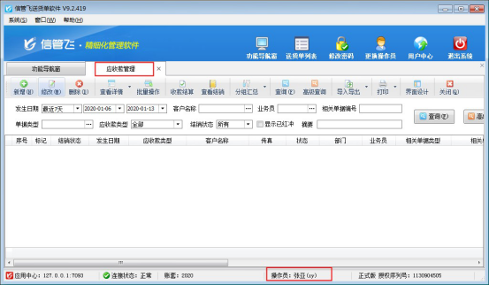 信管飛送貨單軟件是集送貨單開(kāi)單打印和應(yīng)收款管理為一體的軟件,軟件支持設(shè)置多操作員登錄以及可設(shè)置操作員的權(quán)限。有時(shí)需要操作員僅能開(kāi)單,不可查看應(yīng)收款記錄該如何設(shè)置?本文以“信管飛送貨單軟件”為例,示范如何設(shè)置操作員不可查看應(yīng)收款? 用“系統(tǒng)管理員”登錄軟件,在功能導(dǎo)航窗點(diǎn)擊“業(yè)務(wù)處理”—》“應(yīng)收款管理”,可查看所有的應(yīng)收款記錄,如下圖所示: 在功能導(dǎo)航窗點(diǎn)擊“系統(tǒng)管理”—》“操作員及授權(quán)”進(jìn)入操作員管理及授權(quán)界面,選擇操作員“張亞”,然后在右側(cè)權(quán)限設(shè)置