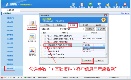 在進銷存軟件里,客戶信息管理至關重要,它能幫助我們維護客戶的基礎資料,為后續的業務開展提供有力支撐。不過,部分用戶反饋,希望能直接在客戶信息界面查看應收款情況,這樣操作起來更便捷高效。下面就為大家詳細介紹具體的設置方法,簡單易懂,幾步就能搞定!     三步開啟智能應收管理,告別繁瑣操作!     一鍵配置,靈活刷新     在功能導航欄點擊“系統管理”—“系統參數配置”,點擊“業務參數”,在“特殊功能參數”中勾選“(基礎資料