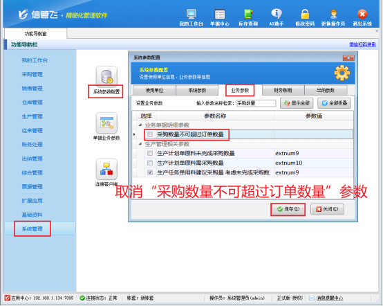 在采購業務里,不少客戶會先按需求開采購訂單,采購人員再依單采購入庫。但實際采購時,常出現采購數量大于訂單數量的情況,當出現這種情況后,部分客戶在進行開單時,會因系統限制,提示采購數量超限而無法保存單據。別擔心,信管飛RMS軟件能輕松化解這一難題!     簡單設置,開啟靈活采購     只需在功能導航窗依次點擊“系統管理”—“系統參數配置”—“業務參數”,進入“業務參數”界面,取消勾選“采購數量不可超過訂單數量”參數,然后點擊“保存”按鈕,配置就完成啦,操作簡單又快