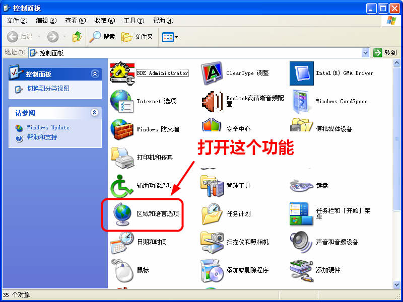 打開“控制面板”中的“區域與語言選項”功能,如下圖所示: