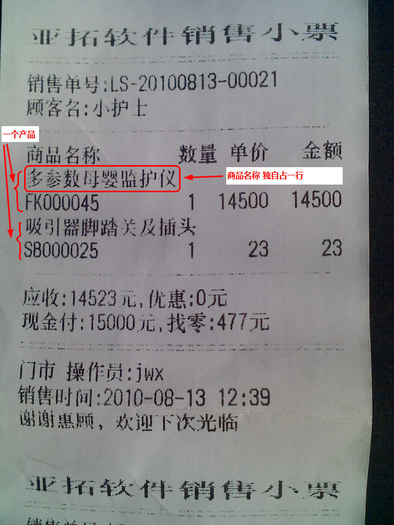有關(guān)商品名稱截?cái)嗟膯栴},如果不復(fù)選“商品名稱截?cái)唷保瑒t系統(tǒng)打印出的效果為下圖所示,商品名稱單獨(dú)占一行,一個(gè)商品總共占兩行。