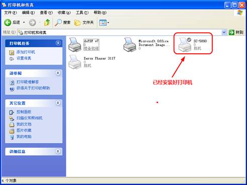 (3)、安裝好驅(qū)動程序后,在“控制面板”的“打印機(jī)和傳真”中,會多出來一個名為“SC-5890”的打印機(jī),如下圖所示: