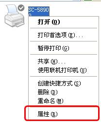 在“打印機(jī)和傳真”中,選中“SC-5890”,點擊鼠標(biāo)右鍵,在右鍵菜單中點“屬性”,如下圖所示: