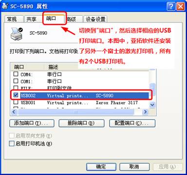 在彈出的屬性窗口,點擊“端口”標(biāo)簽頁,選擇相應(yīng)的USB打印端口,如下圖,我們選擇USB002打勾,這是一個虛擬打印USB端口(Virtual Printer Port For USB),一般大家的機(jī)器如果只有一個USB口的打印機(jī),則選擇USB001即可。