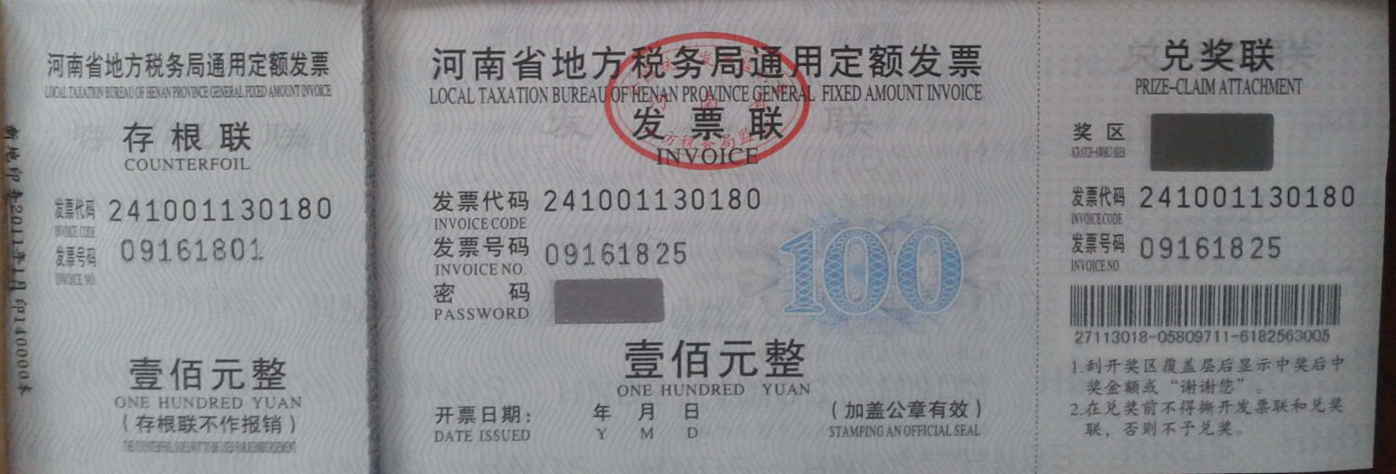 我公司目前針對非項目類產品銷售統一開具《河南省地方稅務局通用定額發票》,發票面值為100元/50元/10元,2011年4月前有少量《河南省鄭州市文化體育娛樂服務業定額》發票,發票面額為200元/100元/10元,均為正規發票,對我公司任何違規開票行為,用戶可隨時撥打河南省地方稅務局服務熱線12366-2進行舉報和投訴。