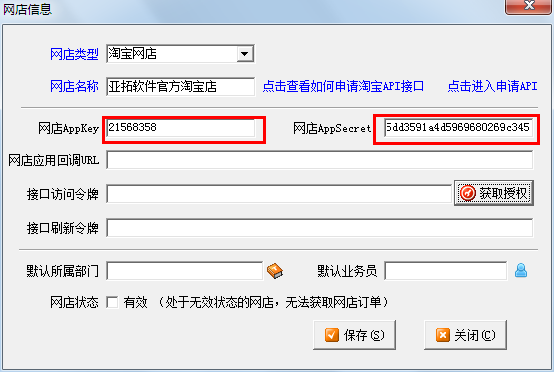 在“網店信息”窗口點擊 “獲取授權”按鈕進行測試,注意由于目前淘寶API的限制,淘寶3鉆以下店鋪申請的API的授權,24小時就會過期,屆時需要重新登錄一下(系統在授權失效時會彈出授權窗口,登錄一下即可)。