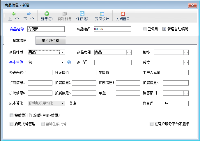 打開亞拓管理軟件,在功能導航窗點“基礎資料”——》“商品信息”,新增商品,錄入商品的基本信息(商品的名稱及基本單位等),如下圖一所示。