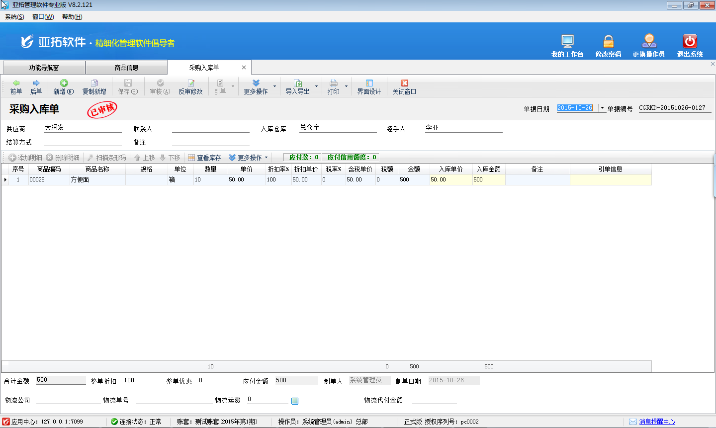 二、新開采購入庫單,采購商品“方便面”十箱,根據(jù)我們提前設置的換算關系可知:十箱等于240包,如下圖三所示。