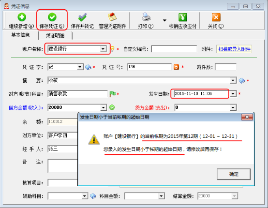 1、日記賬憑證上面的“發(fā)生日期”不能小于資金賬戶當(dāng)前賬期的起始日期。做日記賬憑證時填寫的“發(fā)生日期”小于該資金賬戶的賬期起始日期,系統(tǒng)會彈出無法保證該憑證的提示信息,如圖2所示。