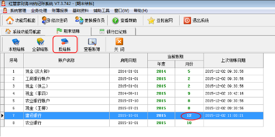 反結(jié)帳:在帳戶列表中,選擇已結(jié)帳的帳戶,點擊工具欄中的“反結(jié)帳”按鈕即可。反結(jié)賬后可以對出現(xiàn)問題的憑證進(jìn)行沖銷但不允許刪除憑證,并可在該賬期增加憑證。