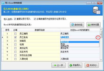 3、配置數(shù)據(jù)項(xiàng)與Excel中數(shù)據(jù)列的對應(yīng)關(guān)系:點(diǎn)“下一步”按鈕配置“數(shù)據(jù)項(xiàng)”與Excel中的數(shù)據(jù)列之間的對應(yīng)關(guān)系。點(diǎn)“自動對應(yīng)”軟件會自動根據(jù)數(shù)據(jù)項(xiàng)名稱和數(shù)據(jù)列列名是否相同進(jìn)行自動匹配。也可以按照下圖5所示手工選擇對應(yīng)關(guān)系。