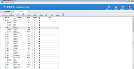 登錄亞拓管理軟件專業(yè)版,在功能導(dǎo)航窗點擊“基礎(chǔ)資料”—》“會計科目”,即可進(jìn)入會計科目管理界面,如圖1所示。