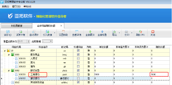 登錄亞拓管理軟件專業(yè)版,點“基礎(chǔ)資料”—》“期初建賬”,然后點“期初科目余額”功能按鈕,進(jìn)入“會計科目期初余額”錄入界面,如圖2所示,可以錄入每個會計科目的年初余額,以及本年的累計借方和貸方(不是從1月份開始啟用賬套時需錄入)。