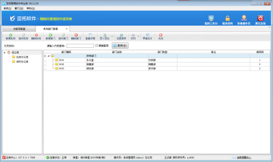 機構部門管理實現對使用單位的分支機構和部門的集中管理!皺C構”即分支機構,是指總部(總公司)下的分支機構(如分公司、辦事處等),部門是總部或分支機構內部的組織。只有亞拓管理軟件專業版有“分支機構”擴展功能模塊,才可以維護分支機構。亞拓管理軟件(標準版、星光版)、紅管家倉庫管理軟件(專業版、標準版)只需要維護部門即可。下面我們以亞拓管理軟件專業版為例來演示一下具體的操作步驟。