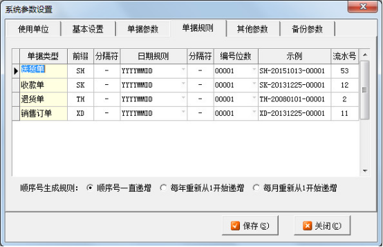 2、順序號生成規(guī)則設(shè)置:可配置各類單據(jù)按順序號一直遞增、每年重新從1開始遞增以及每月重新從1開始遞增,將各項(xiàng)數(shù)據(jù)配置好之后點(diǎn)擊保存即可。