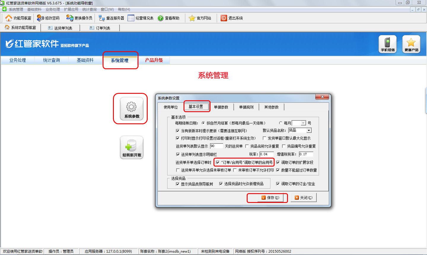 在功能導(dǎo)航窗點擊“系統(tǒng)管理”——》“系統(tǒng)參數(shù)”打開系統(tǒng)參數(shù)設(shè)置界面,在“系統(tǒng)參數(shù)”——》“基本設(shè)置”界面,打勾選中“訂單/合同號調(diào)取訂單的合同號”選項啟用“訂單合同號調(diào)取訂單的合同號”的功能,配置完之后點擊“保存”按鈕保存設(shè)置即可,如下圖所示: