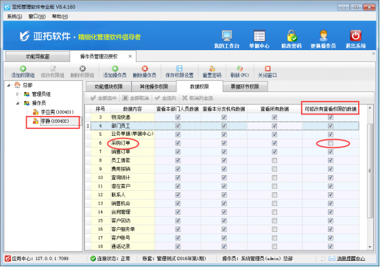 通過系統(tǒng)管理員登錄軟件進行修改操作員權限,只有系統(tǒng)管理員才能修改操作員權限,我們以操作員“李靜”為例介紹下數(shù)據(jù)權限的設置,通過“采購管理”—》“采購訂單”—》“數(shù)據(jù)權限”。在數(shù)據(jù)權限界面,勾選掉操作員李靜的“可修改有查看權限的數(shù)據(jù)”權限,然后點擊“保存權限設置”進行保存權限,操作如圖2所示:圖2
