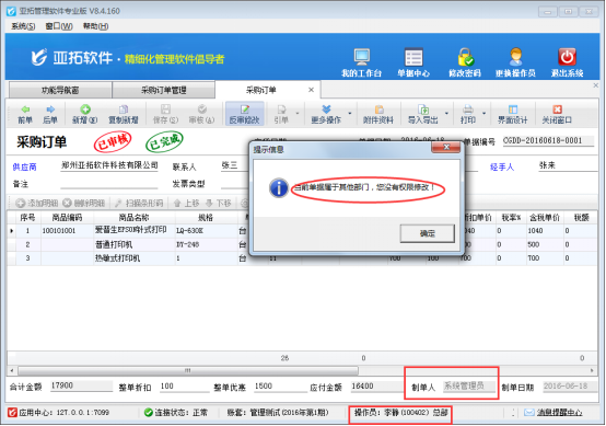 單據(jù)權限設置成功后,以操作員李靜的身份登錄軟件,打開已審核的“采購訂單”選擇“反審修改”,如果制單人不是李靜,則會提示信息“當前單據(jù)屬于其他部門,您沒有權限進行修改”。操作員李靜只能反審修改自己制的采購訂單,無法修改其他部門人員的單據(jù)。如圖3所示:圖3