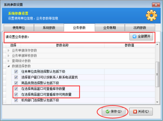 在功能導(dǎo)航窗,點擊“系統(tǒng)參數(shù)配置”—》“業(yè)務(wù)參數(shù)”選擇“數(shù)據(jù)選擇參數(shù)”進行設(shè)置,(為了更快捷的設(shè)置業(yè)務(wù)參數(shù),可以先把設(shè)置業(yè)務(wù)參數(shù)“全部折疊”,直接查找“數(shù)據(jù)選擇參數(shù)”項),勾選參數(shù)后記得保存,具體操作如圖1所示: