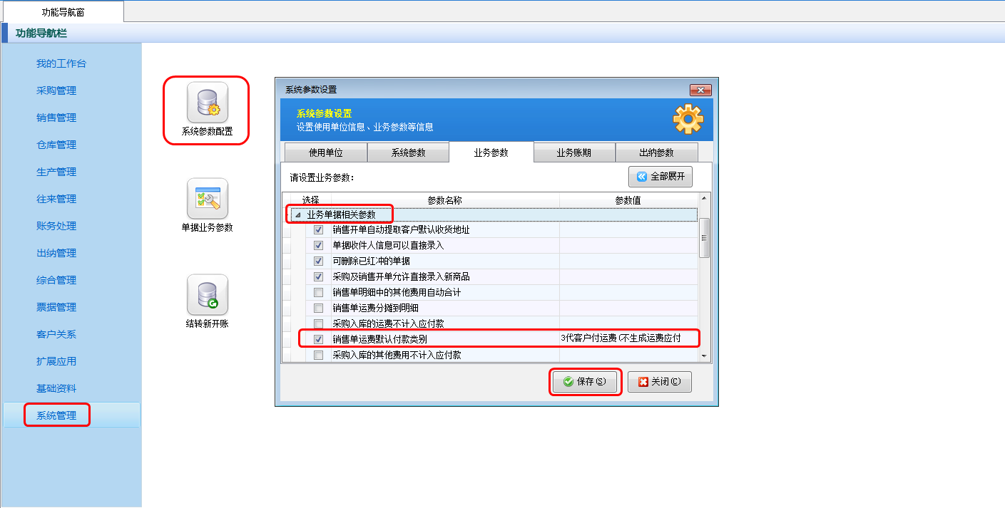 在功能導航窗點擊“系統(tǒng)管理”—》“系統(tǒng)參數(shù)配置”—》“業(yè)務參數(shù)”,即可進入到“業(yè)務參數(shù)”界面,在業(yè)務單據(jù)相關參數(shù)內可以設置參數(shù)“銷售單運費默認付款類別”的參數(shù)值,此處設置為“3代客戶付運費(不生成運費應付款,運費計入應收金額)”,設置完點擊“保存”按鈕保存配置,如下圖一所示。