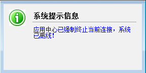 設置完之后再次登錄系統(tǒng)時,如果當前登錄的操作員已經(jīng)登錄了系統(tǒng),則應用中心會強制斷開之前的連接,在系統(tǒng)右下角會彈出POP窗提示“應用中心已強制終止當前連接,系統(tǒng)已離線!”,如下圖二所示。