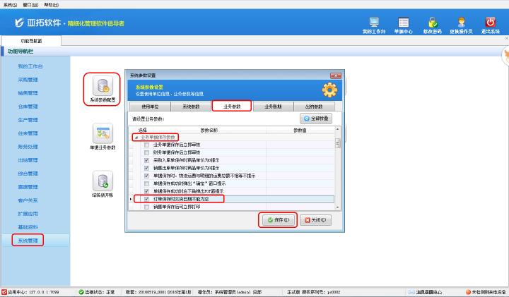 亞拓管理軟件、紅管家倉庫管理軟件、紅管家送貨單軟件等都可以設(shè)置訂單保存時(shí)交貨日期不能為空,本篇文章以亞拓管理軟件專業(yè)版為例介紹一下如何設(shè)置訂單保存時(shí)交貨日期不能為空,通過“系統(tǒng)管理”——》“系統(tǒng)參數(shù)配置”——》“業(yè)務(wù)參數(shù)”可以進(jìn)入“業(yè)務(wù)參數(shù)”配置界面,在業(yè)務(wù)單據(jù)保存參數(shù)內(nèi)打勾啟用“訂單保存時(shí)交貨日期不能為空”參數(shù),如下圖一所示。