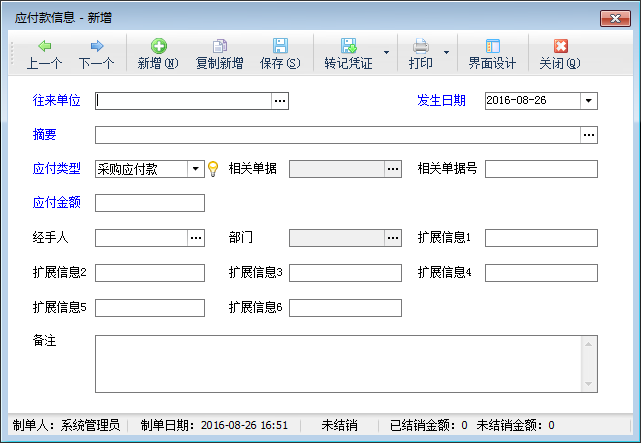 應(yīng)付類(lèi)型:應(yīng)付類(lèi)型包括采購(gòu)應(yīng)付款、采購(gòu)預(yù)付款、采購(gòu)?fù)素洃?yīng)退款、期初應(yīng)付款、其他應(yīng)付款,應(yīng)付類(lèi)型有特殊含義無(wú)法維護(hù),如果需要標(biāo)注其他應(yīng)付類(lèi)型可以填寫(xiě)到擴(kuò)展信息中。