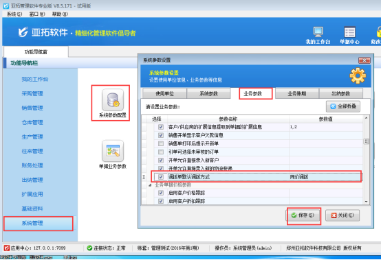 以亞拓管理軟件為例,首先設置參數(shù),在導航窗“系統(tǒng)管理”->系統(tǒng)參數(shù)配置->選擇“業(yè)務參數(shù)”的“調撥單默認調撥方式”,后邊的參數(shù)值可選擇同價調撥或者變價調撥(示例選擇同價調撥)。勾選上此參數(shù)保存即可。具體如下圖: