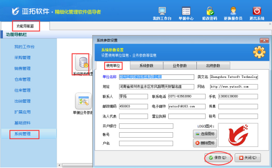 在“系統管理”—》“系統參數配置”中修改單位名稱為“亞拓軟件”,修改后記得保存。保存會提示“系統參數設置保存成功”。具體如下圖所示: