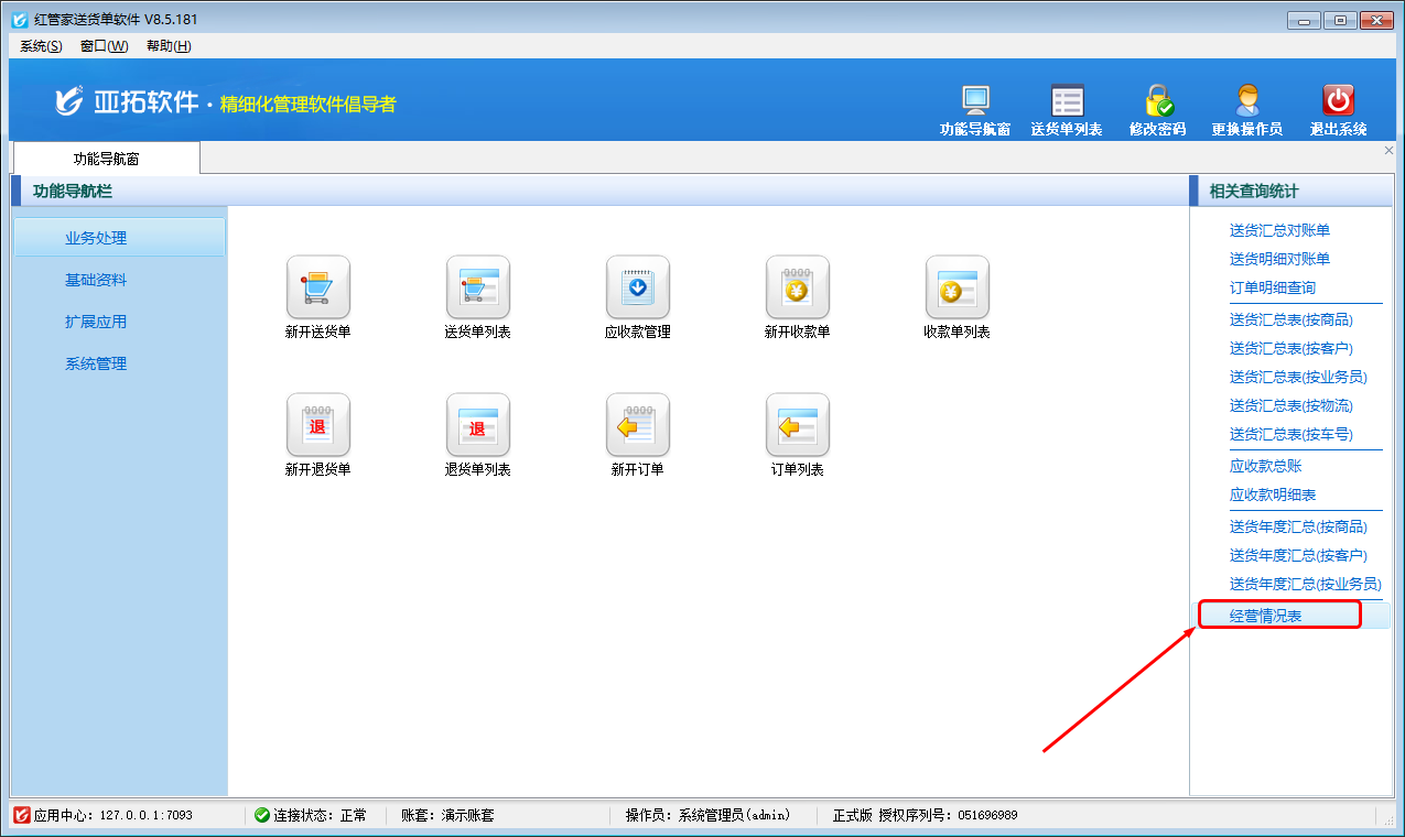 在功能導航窗點擊“業(yè)務處理”—》“相關統(tǒng)計查詢”(如下圖三所示),在相關統(tǒng)計查詢內(nèi)點擊“經(jīng)營情況表”可以查看經(jīng)營情況及銷售毛利,如下圖四中所示,今日應收款金額為320元,成本金額為288元,銷售毛利為32元(銷售金額-成本金額=銷售毛利),毛利率為10%(毛利率=毛利/營業(yè)收入×100%=(營業(yè)收入-營業(yè)成本)/營業(yè)收入×100% )。